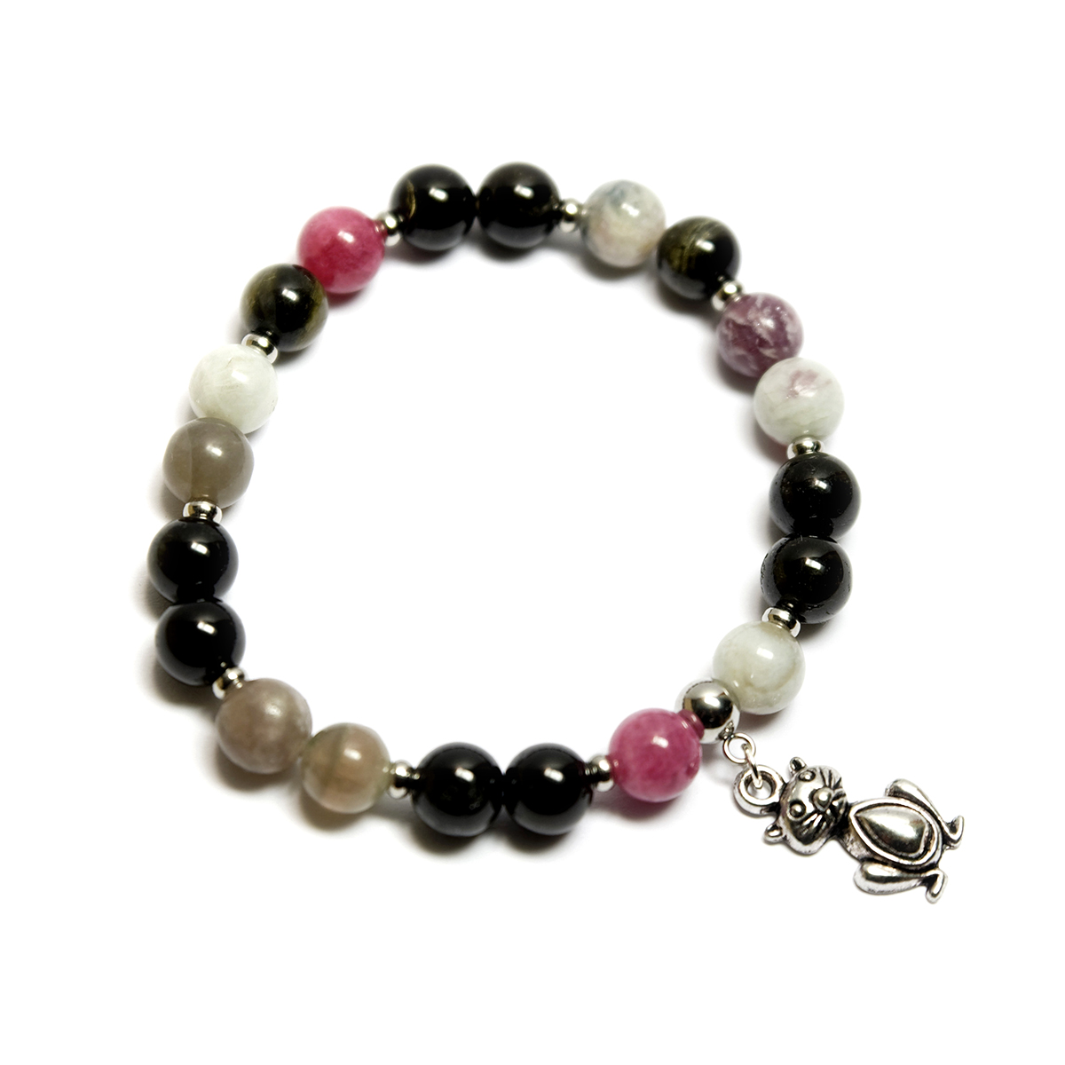 Apyrankėje suverti natūralaus turmalino akmens karoliukai, platinos spalvos metalo detalės.